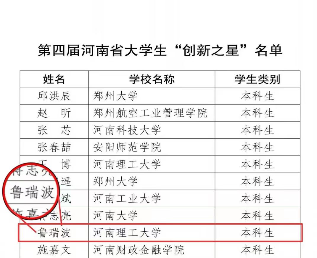 本科生遥感2204班鲁瑞波凭借其优秀的创新能力,从众多参赛选手中脱颖而出,荣获河南省大学生“创新之星”称号,为PG娱乐