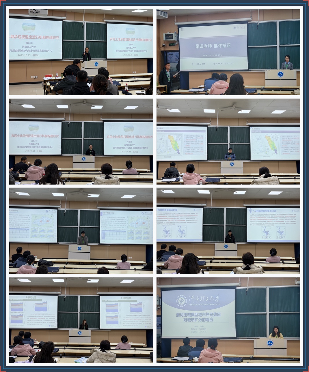 在河南省自然资源学会2025年学术年会暨河南省资源与环境学术交流会优秀报告评审环节,肖东洋、易海杰分别荣获分论坛报告一等奖和三等奖,孙崇严、郭伊、张燕等三名研究生荣获分论坛报告三等奖,孙玉豪、李珍珍、翟佩升、孔浩、王洁晨等五位研究生荣获分论坛报告优秀奖。